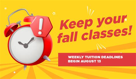 Fall Tuition Deadline. If you register on or after the due date, payment is due upon registration. Last day to withdraw with 50% tuition refund or credit,.